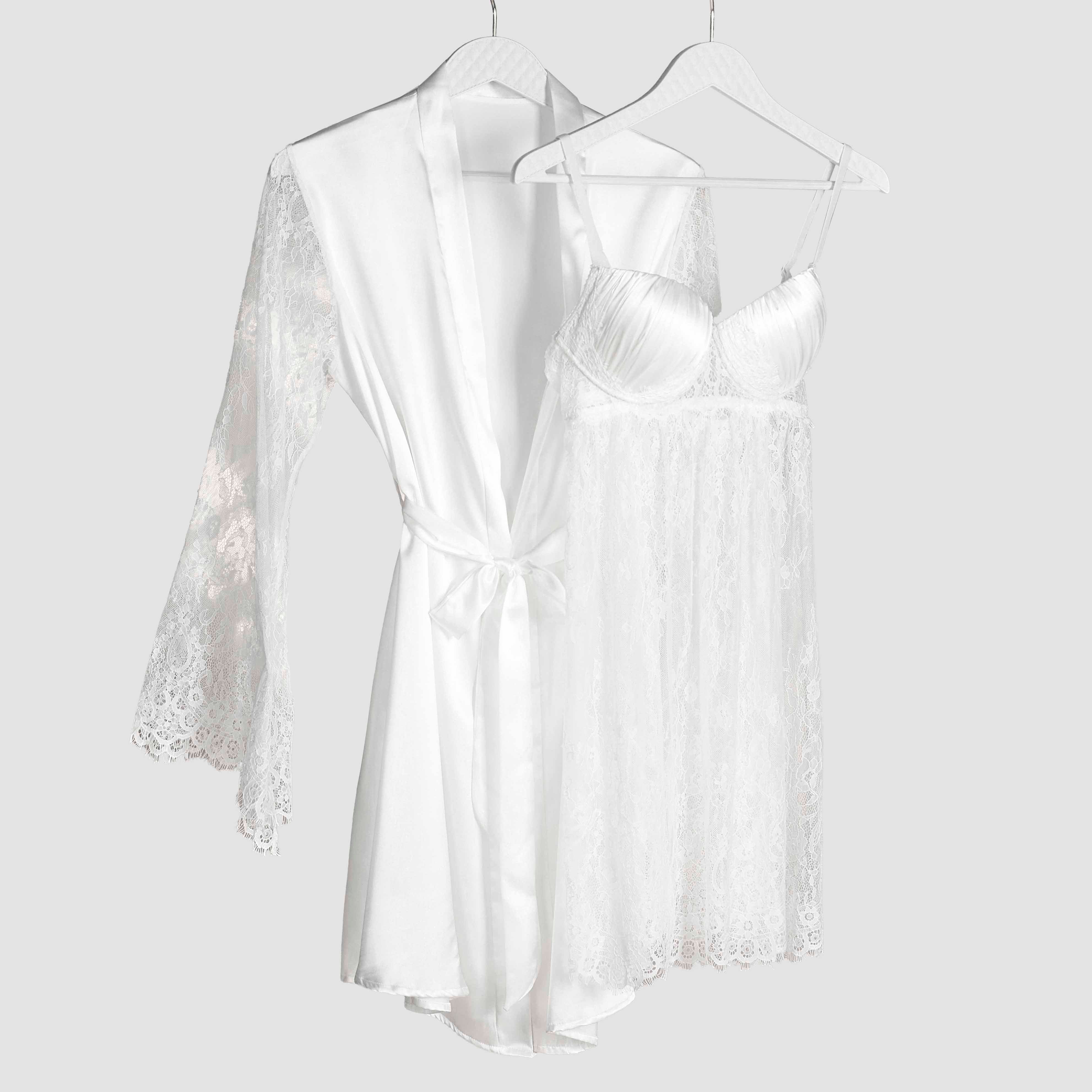 احتضني الأناقة الحالمة مع هذه المجموعة الفاخرة التي تضم فستان نوم رقيق ورداء متناسق مصنوع من الدانتيل الأبيض الناعم ولمسات من الساتان الرفيع. يبرز فستان النوم أنوثتك بقصة أنيقة وجذابة، بينما يزين الرداء بأكمام مزينة بالدانتيل لإنهاء أنيق ومصقول.