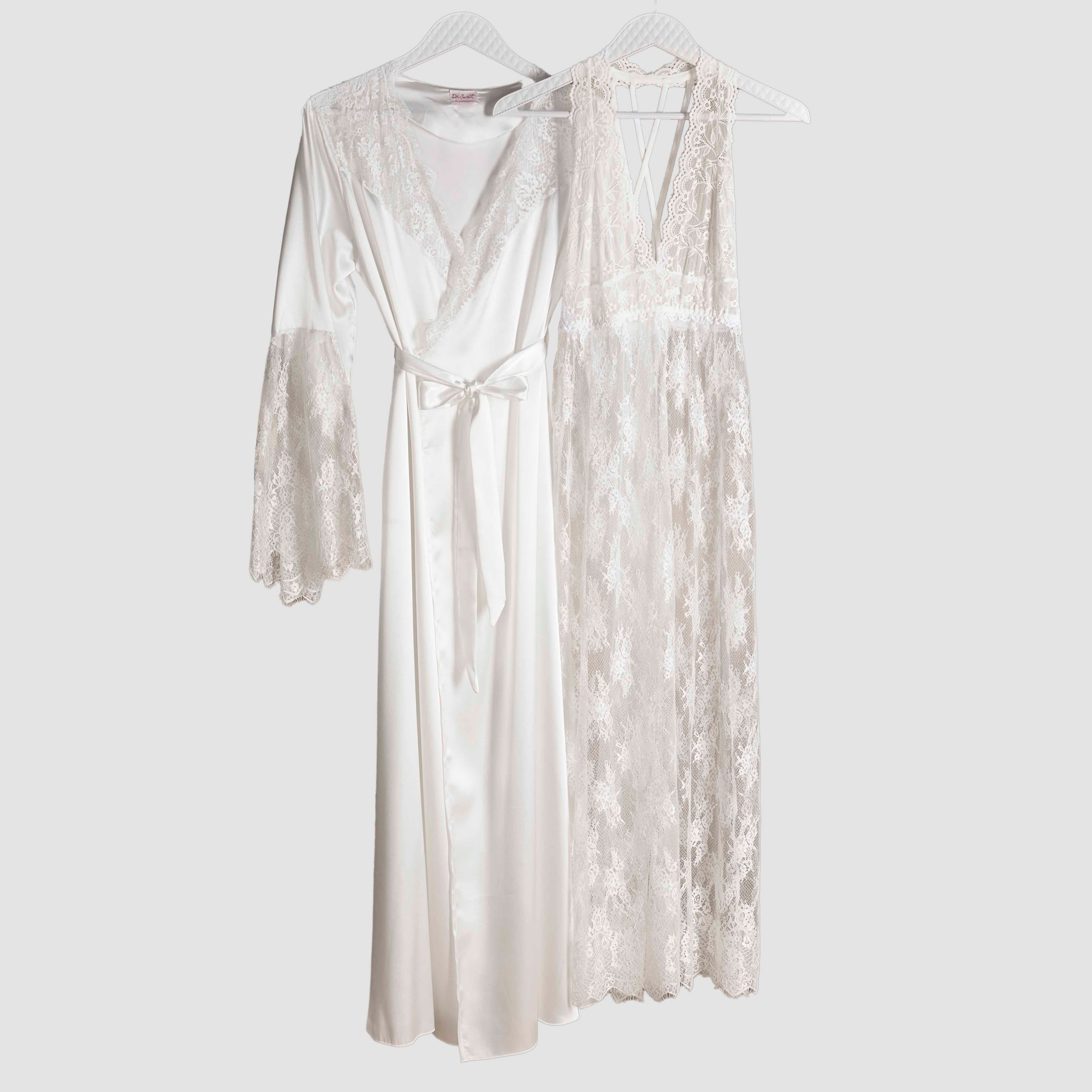 أضف لمسة من الأناقة والفخامة إلى مجموعة ملابس النوم الخاصة بك مع هذه المجموعة الراقية. تم تصميم فستان النوم من ساتان ناعم وعالي الجودة مع تفاصيل من الدانتيل الرقيق التي تخلق لمسة رومانسية جميلة وأنثوية. يأتي مع رداء طويل مزود بأكمام واسعة ولوحات دانتيل شفافة لمظهر مصقول وجذاب. مثالي للليالي الخاصة والمناسبات الأنيقة. احصل على نسختك الآن واستمتع بمظهر لا يقاوم وأنيق!