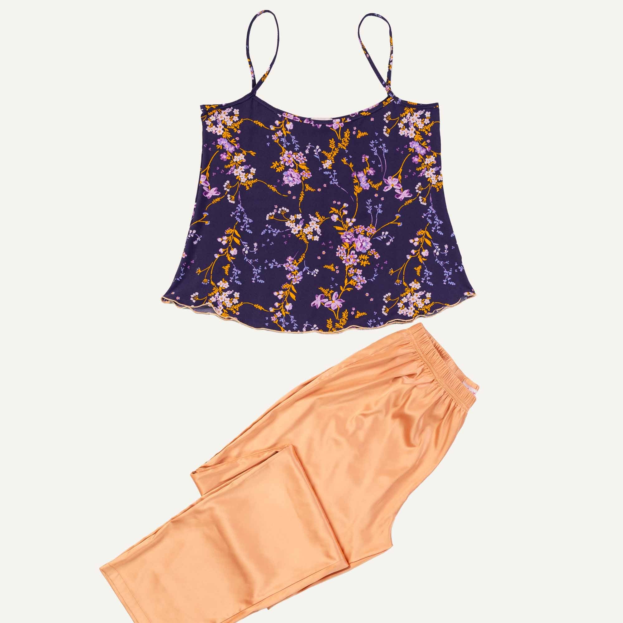 استمتع بليالي هادئة ومظهر أنيق مع مجموعة البيجاما الفاخرة هذه المصنوعة من الساتان الناعم للغاية. تتميز بكاميول رقيق وأنثوي مع أحزمة رفيعة ونقوش زهرية أنيقة، مقترنة بسروال ساتان مريح بقصة متدفقة لسهولة الحركة. تضمن نسيجها الحريري والناعم راحة لا مثيل لها، مما يجعلها الخيار المثالي للاسترخاء الأنيق أو لقضاء ليلة نوم هانئة.