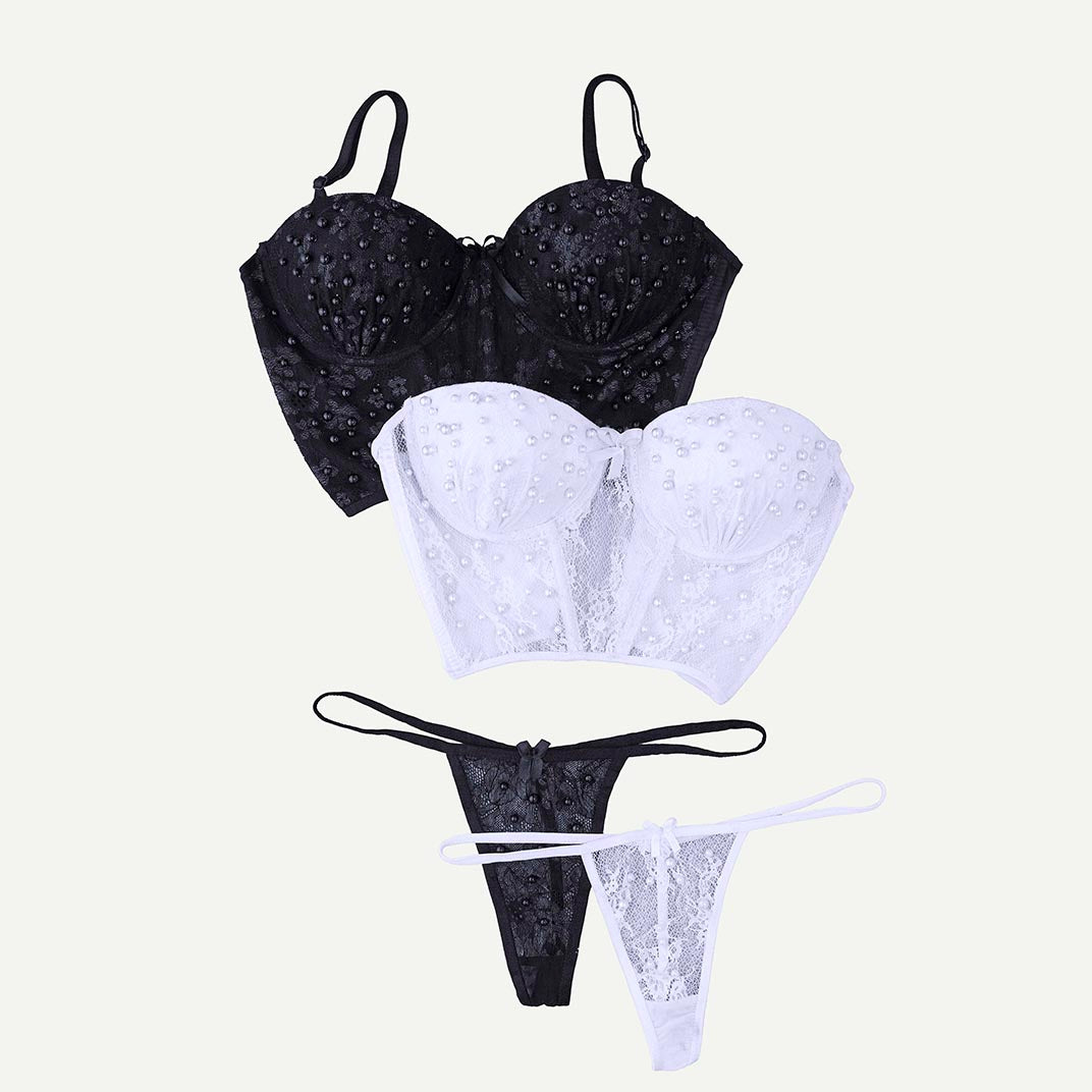 استمتع بلمسة من الفخامة والجاذبية مع مجموعة البوستيه المصنوعة يدويًا، المصنوعة من الدانتيل الرائع والمزينة بالخرز اللامع لمظهر ساحر حقًا. تتضمن المجموعة كورسيه مصقول يوفر كل من الأناقة والدعم، مقترنًا بقطعة مطابقة رقيقة تضيف لمسة من الجرأة والأنوثة. متاحة باللون الأسود الكلاسيكي أو الأبيض النقي لتناسب أسلوبك. مثالية للمناسبات الخاصة واللحظات التي لا تُنسى.