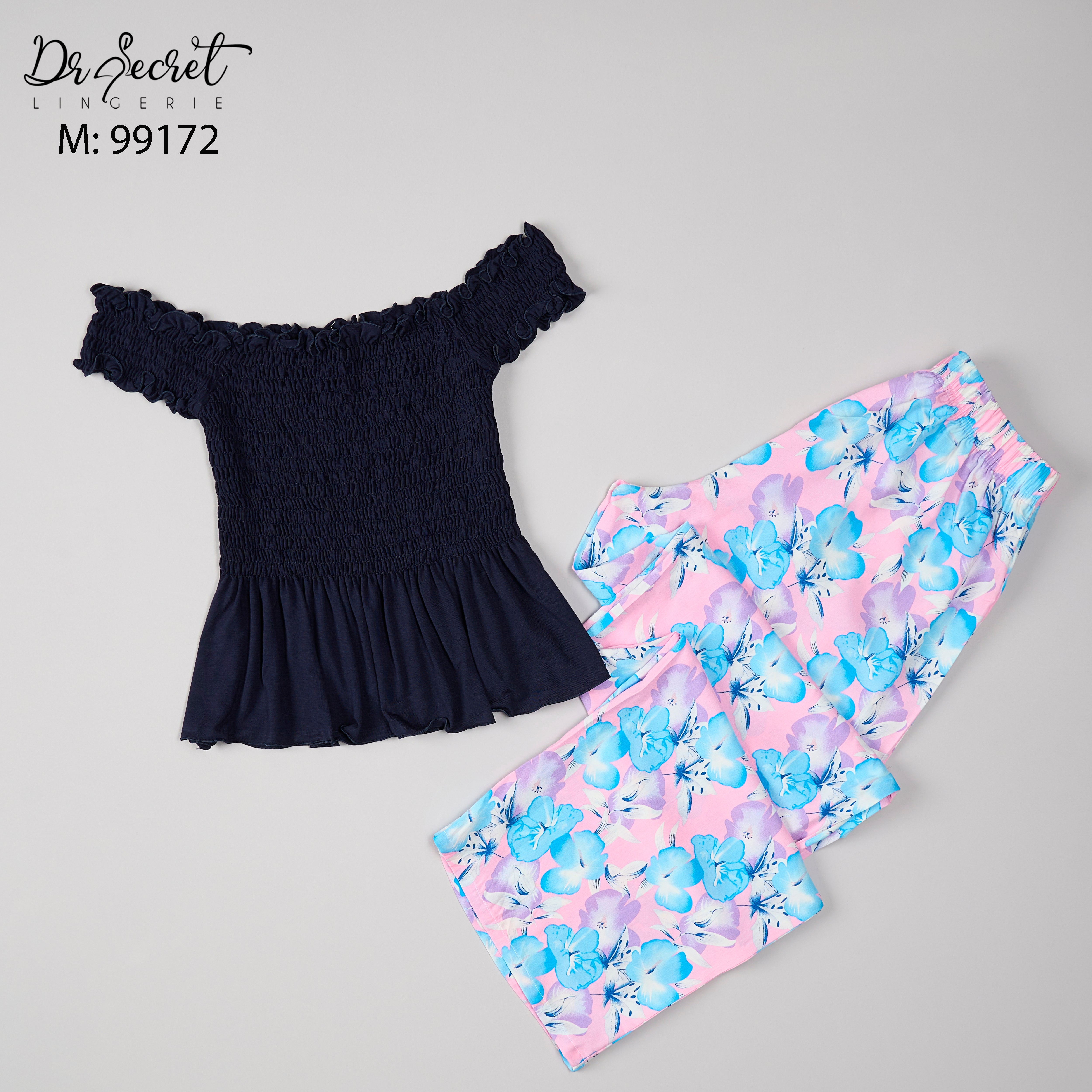 تقدم البلوزة المكشوفة الكتفين المصنوعة من قماش القطن المرن راحة مطلقة وسلاسة بلا جهد، بينما سروال البيجاما القطني المنسوج مزين بطبعات زهرية رقيقة، مما يضيف لمسة من الفرح وسحر لطيف لمظهرك.