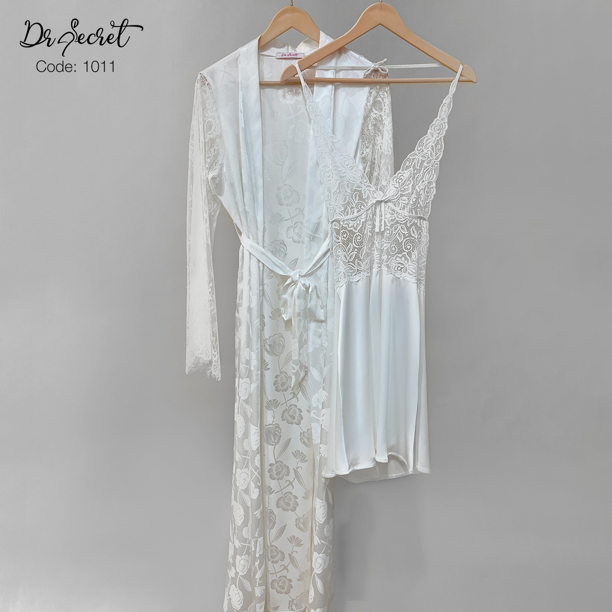 Embrace dreamy elegance with this luxurious satin and lace set. The nightdress features a feminine silhouette with delicate thin straps and refined lace details, while the sheer floral-embroidered robe adds a touch of irresistible charm. A perfect choice for brides or any woman seeking a blend of sophistication, comfort, and beauty.