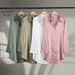 The classic collar and button-down front create a refined, high-end feel—perfect for lounging, layering, or styling up for an elevated, easygoing look. Available in a palette of soft, modern tones, each color enhances the satin's natural shine for a chic, polished finish.