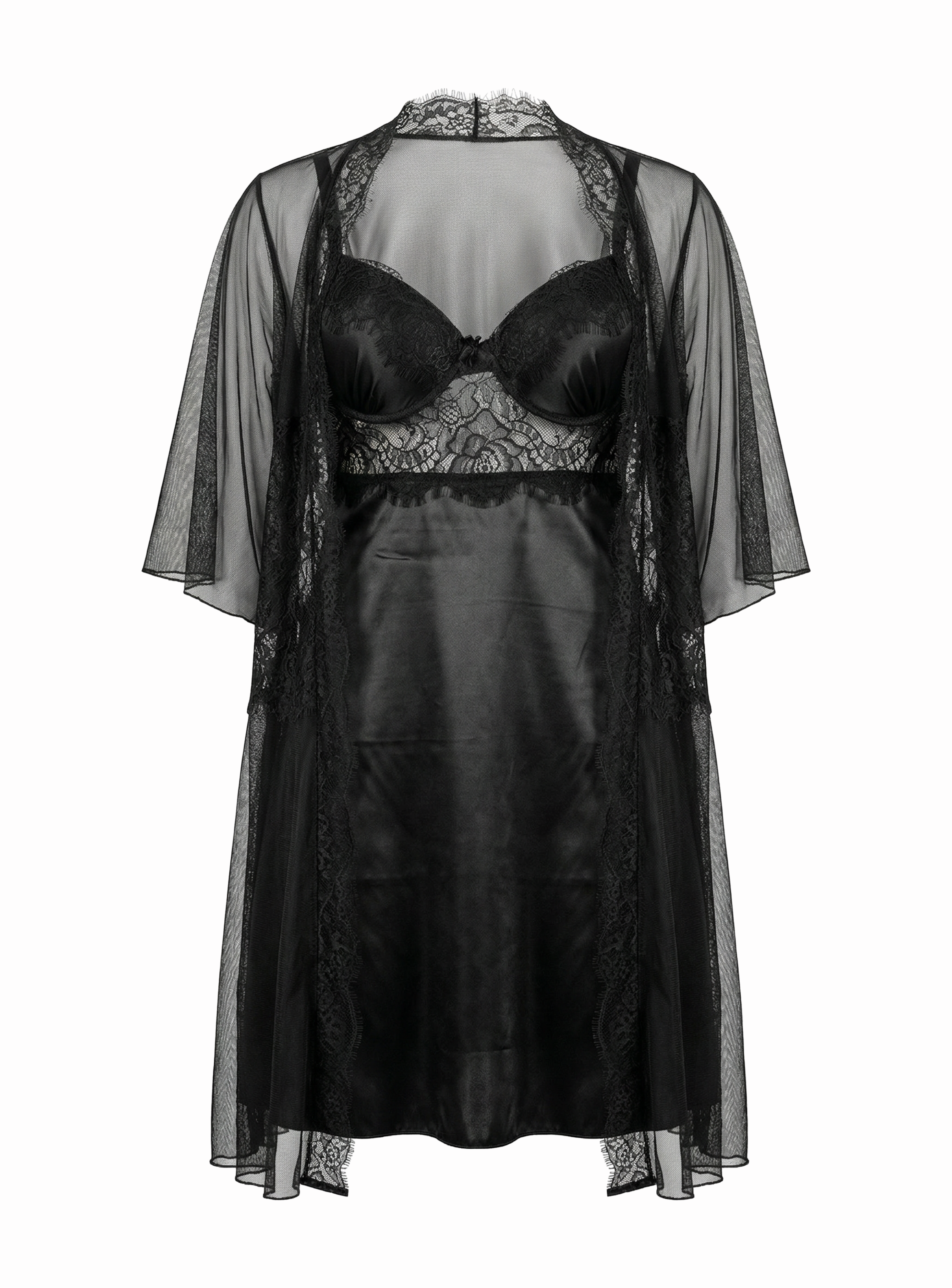 The matching sheer robe features lightweight mesh fabric with lace accents and wide sleeves, creating a graceful and refined look. Perfect for special evenings or for women who love a blend of elegance, comfort, and sensual style.