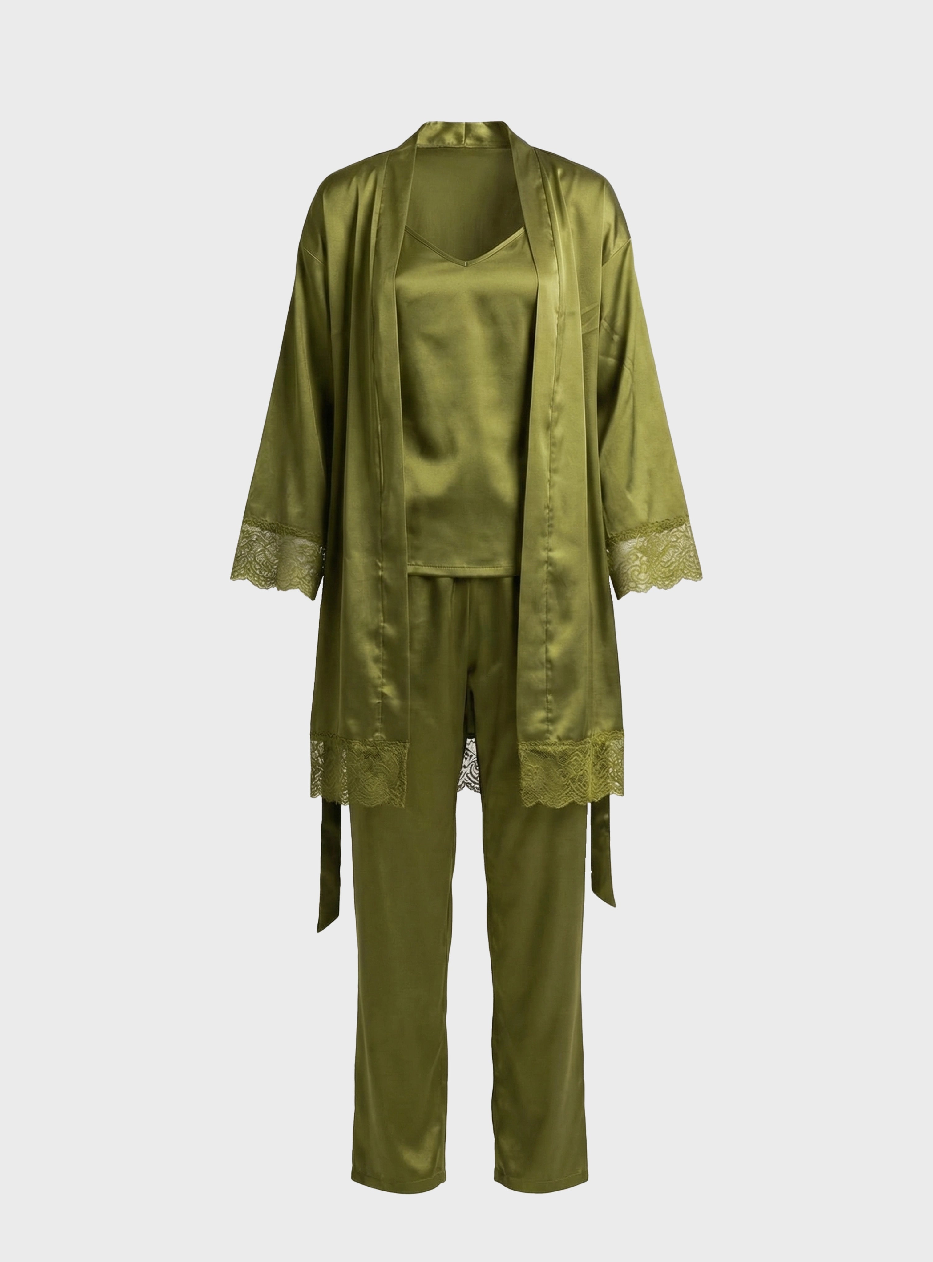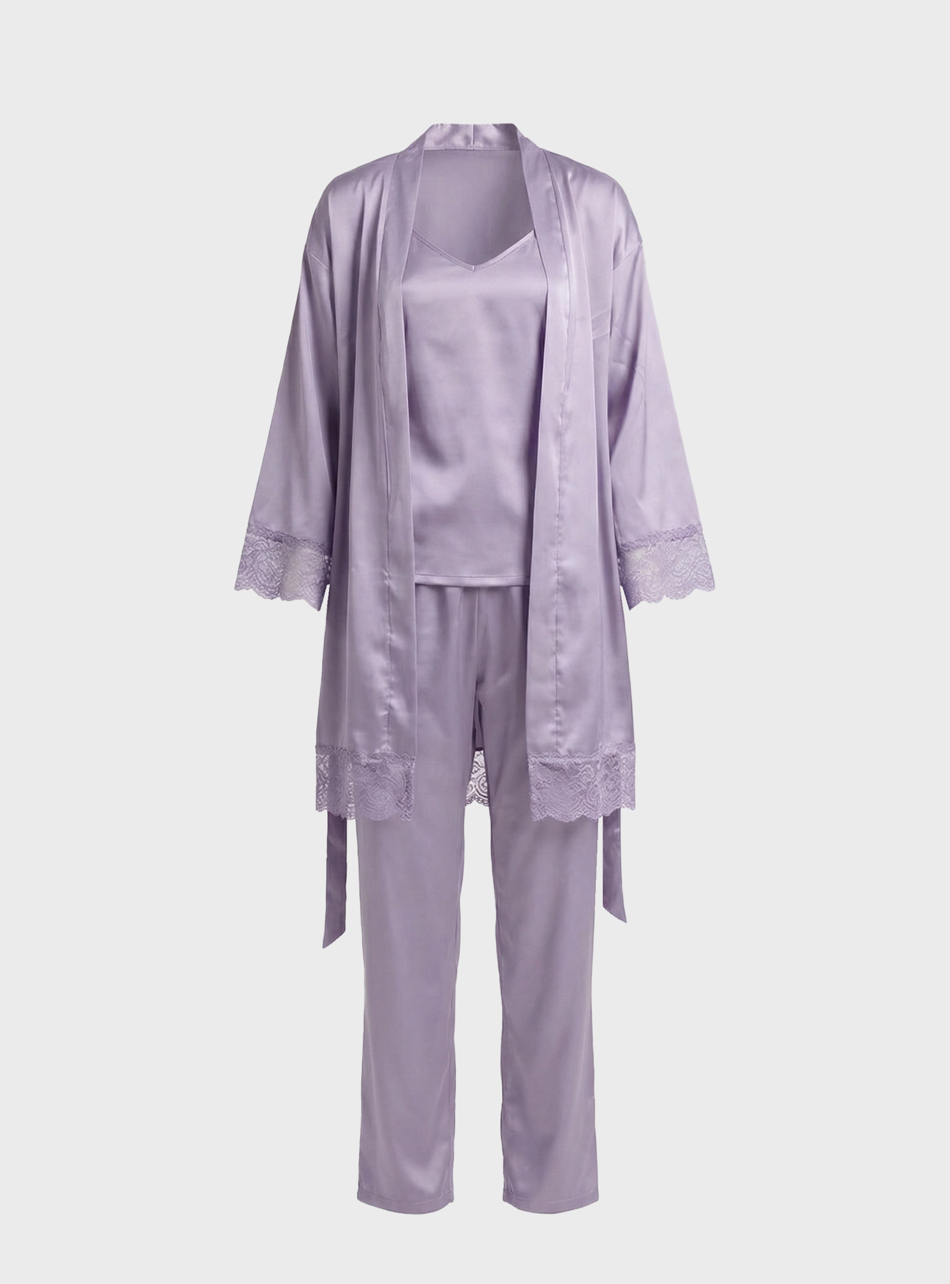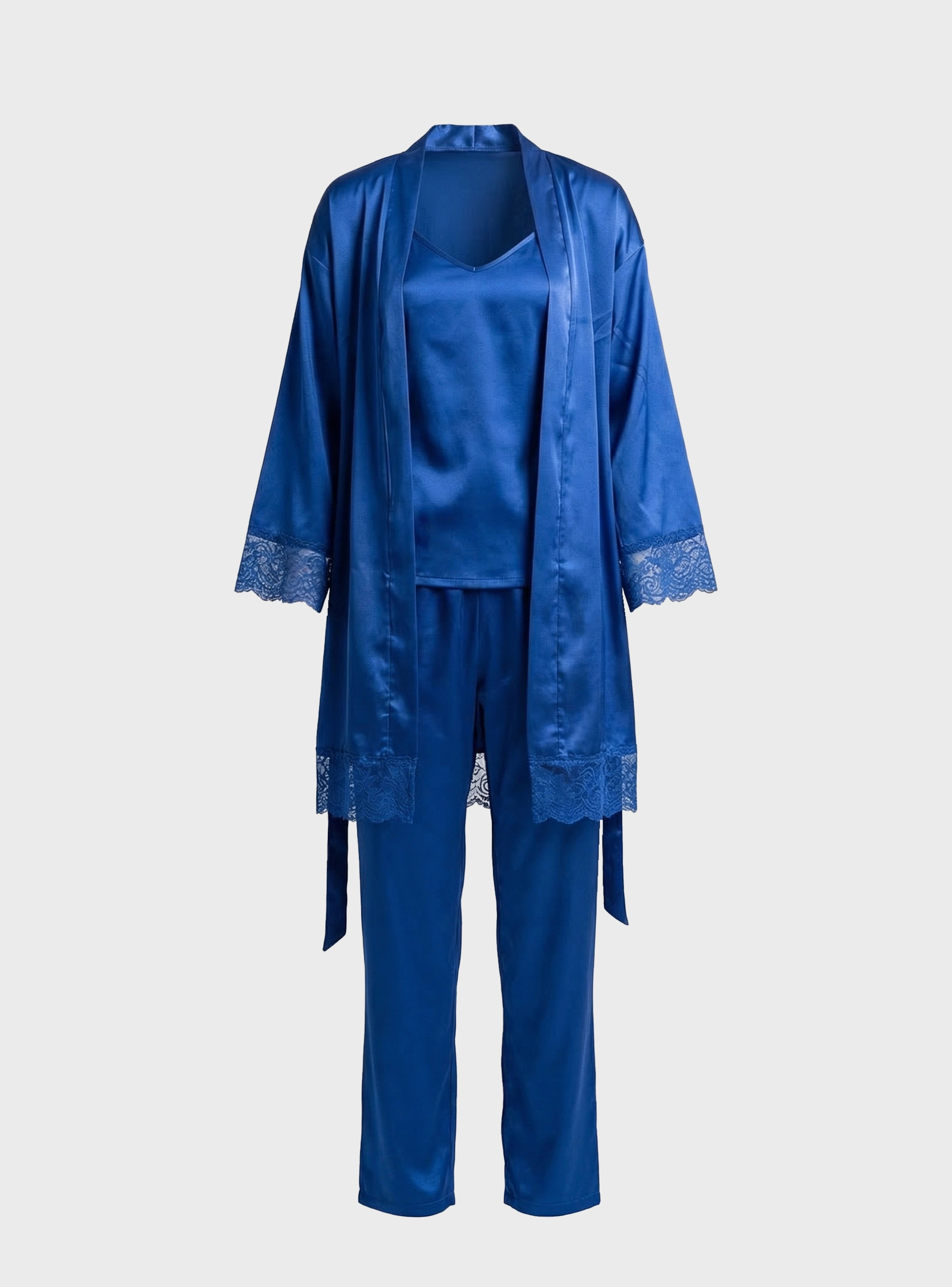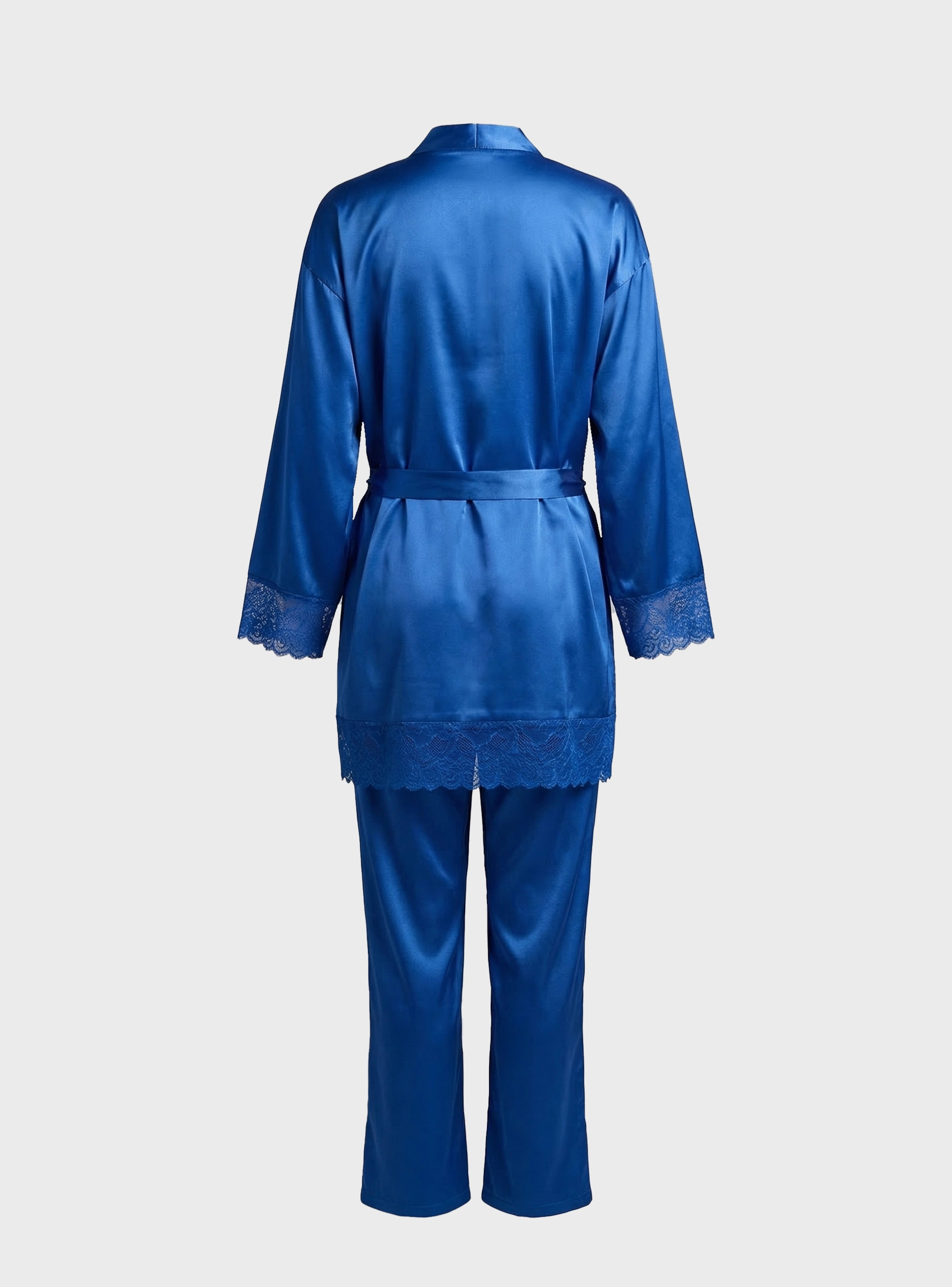 Completing the look is a graceful robe with lace details, adding a touch of sophistication and making the set perfect for relaxing at home while still feeling elegant.