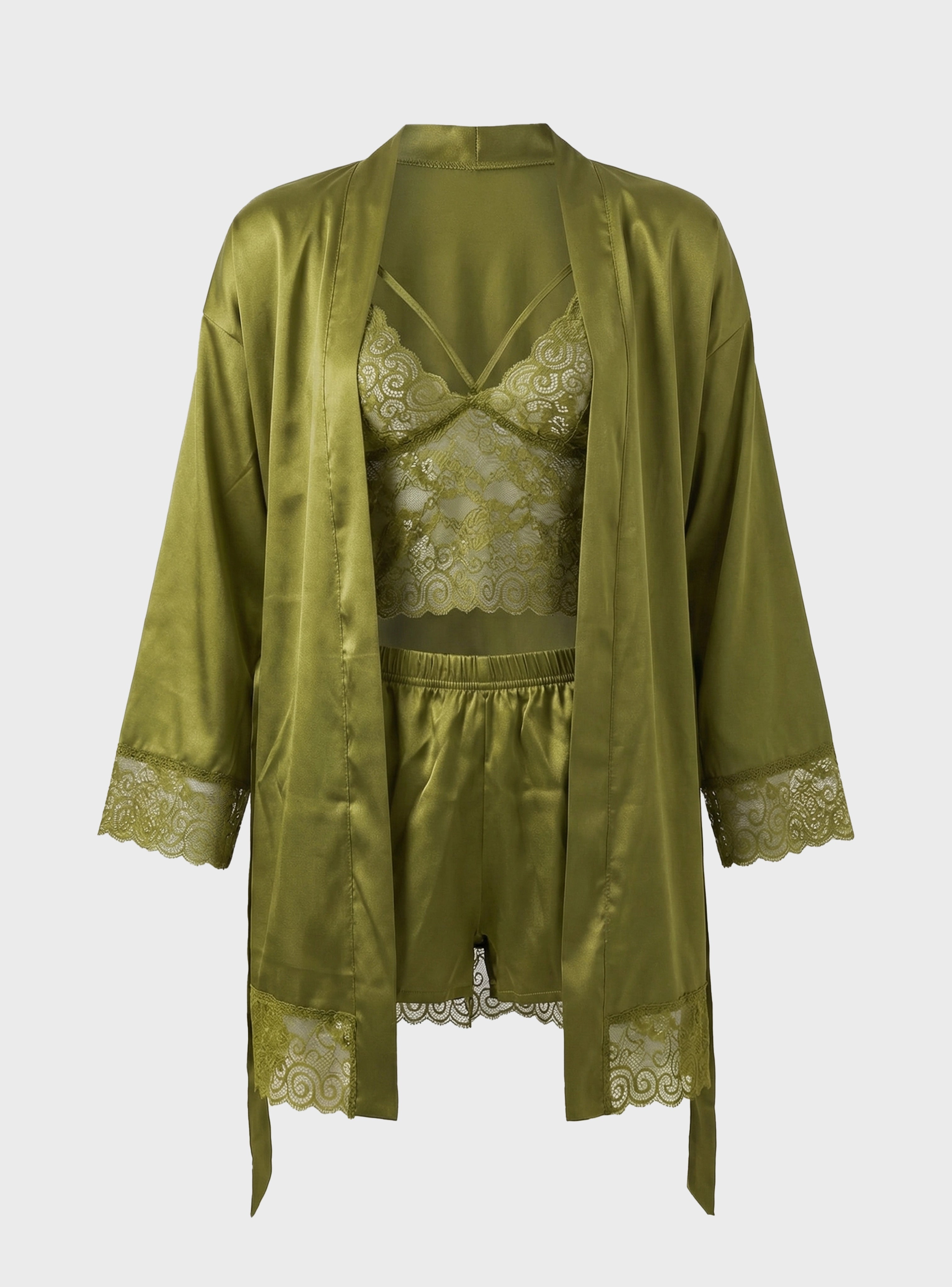 This refined set features a delicate lace top that adds a soft, feminine charm, paired with a smooth satin camisole for a comfortable and elegant feel. The set also includes lightweight shorts and long pants, allowing you to choose the perfect option for different moods and seasons.