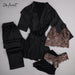 Step into luxury with this stunning four-piece set that blends silky satin with sensual leopard lace. The set includes a flowing satin kimono with a waist tie, wide-leg satin pants, a delicate lace-trimmed leopard bralette, and matching shorts for a complete look of comfort and allure.