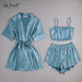 The set includes a flowy satin kimono with a waist tie, a chic ruched satin bralette with slim straps, and matching satin shorts for a graceful and modern look.