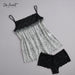 Experience delicate beauty with this charming two-piece lace set in ivory and grey tones. The top features thin adjustable straps and a graceful flowy silhouette crafted from intricate floral lace that gently drapes over the body. Paired with matching lace shorts, it offers both femininity and comfort in every detail.