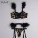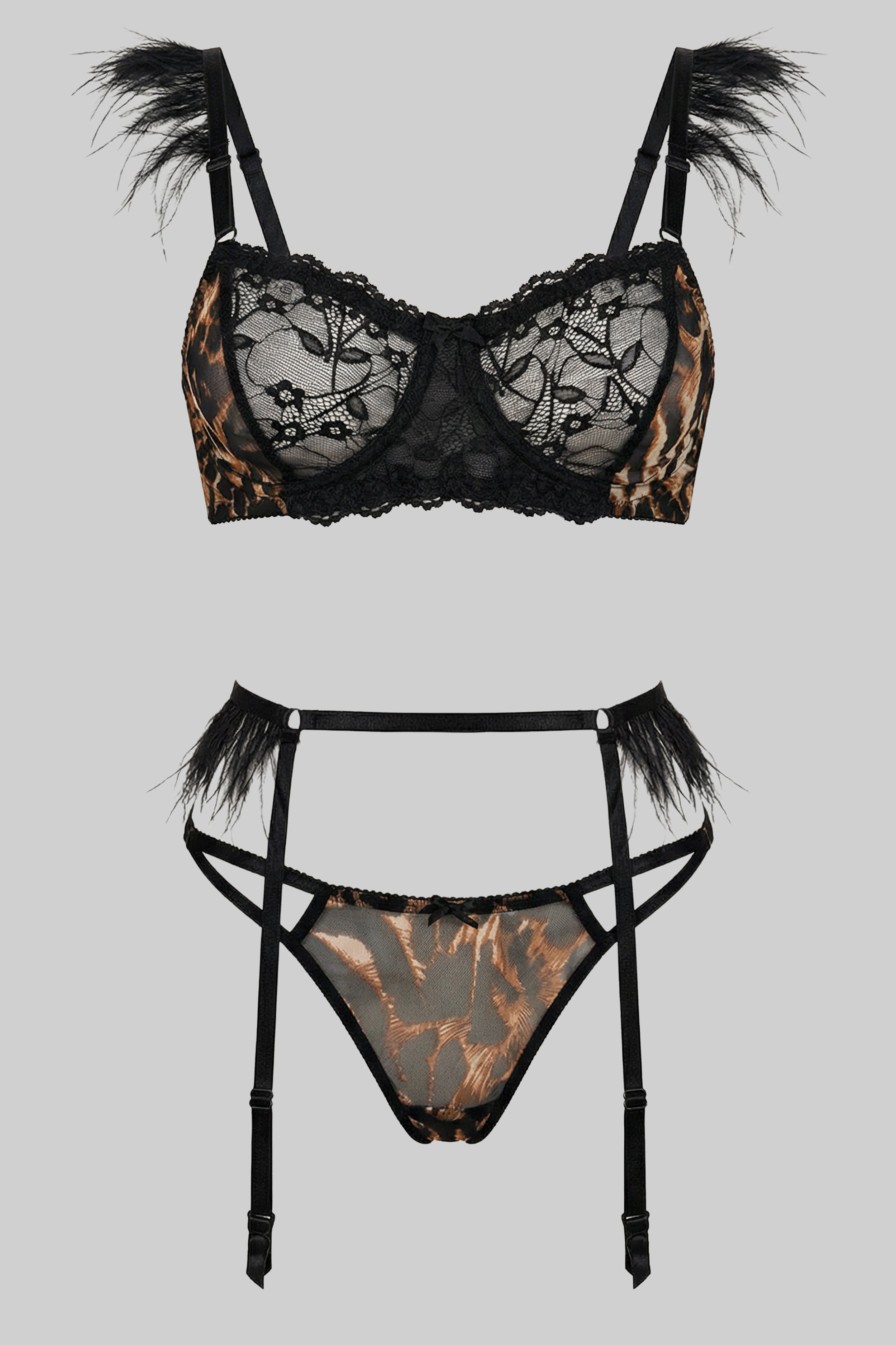 Dare to dazzle with this bold and luxurious garter lingerie set, featuring an exclusive print and lavish feather details. The set includes a sheer bra adorned with elegant embroidery and adjustable straps for a perfect fit. Paired with a seductive open-design panty and a matching garter belt for a strikingly alluring look. Perfect for special occasions or adding a glamorous, feminine touch to your intimate collection.