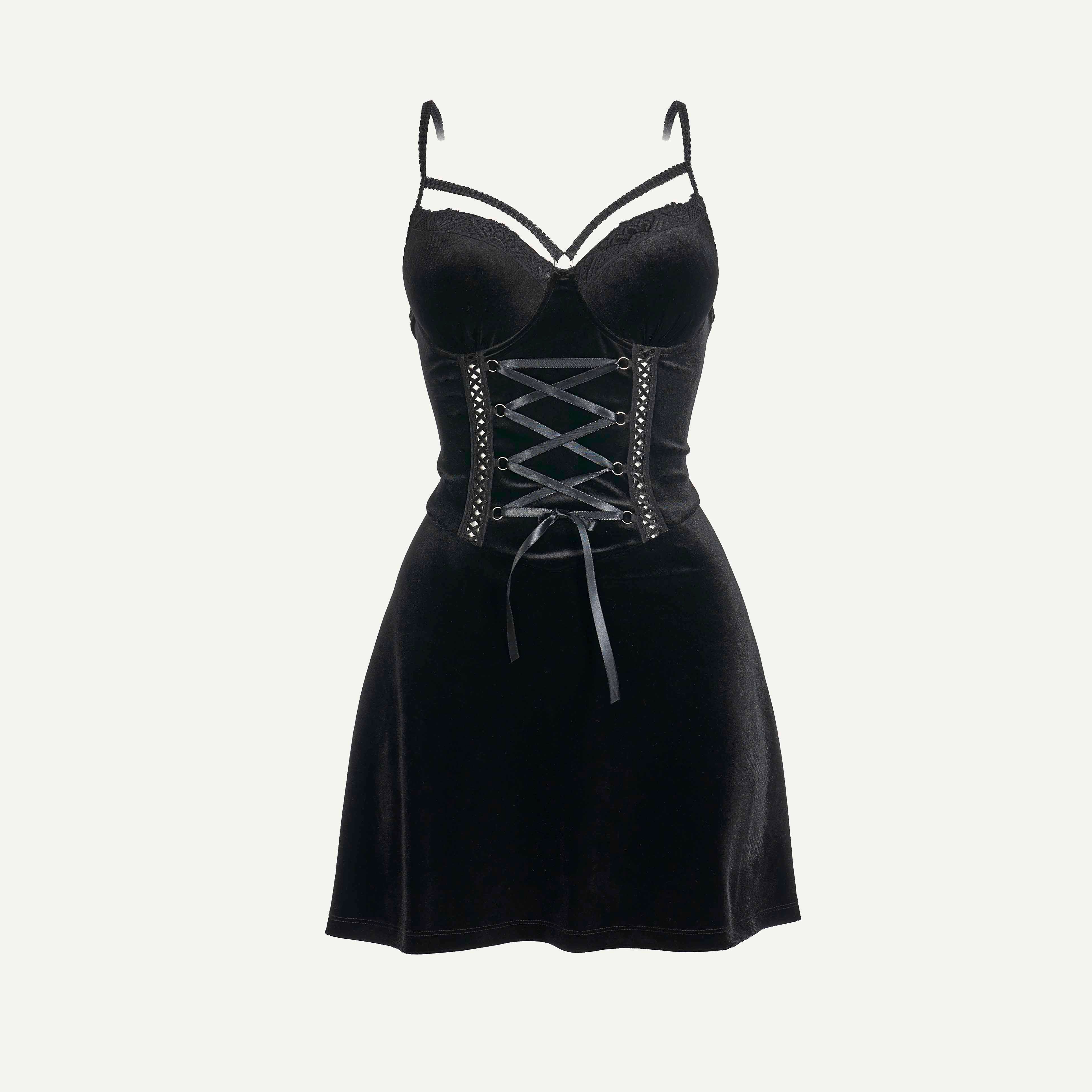 For a look that blends femininity with daring allure, choose this exquisite velvet corset dress. Crafted from ultra-soft, luxurious velvet fabric, it features a chic short cut, delicate thin straps, and a front lace-up corset detail that beautifully enhances your silhouette while adding a touch of distinctive elegance.