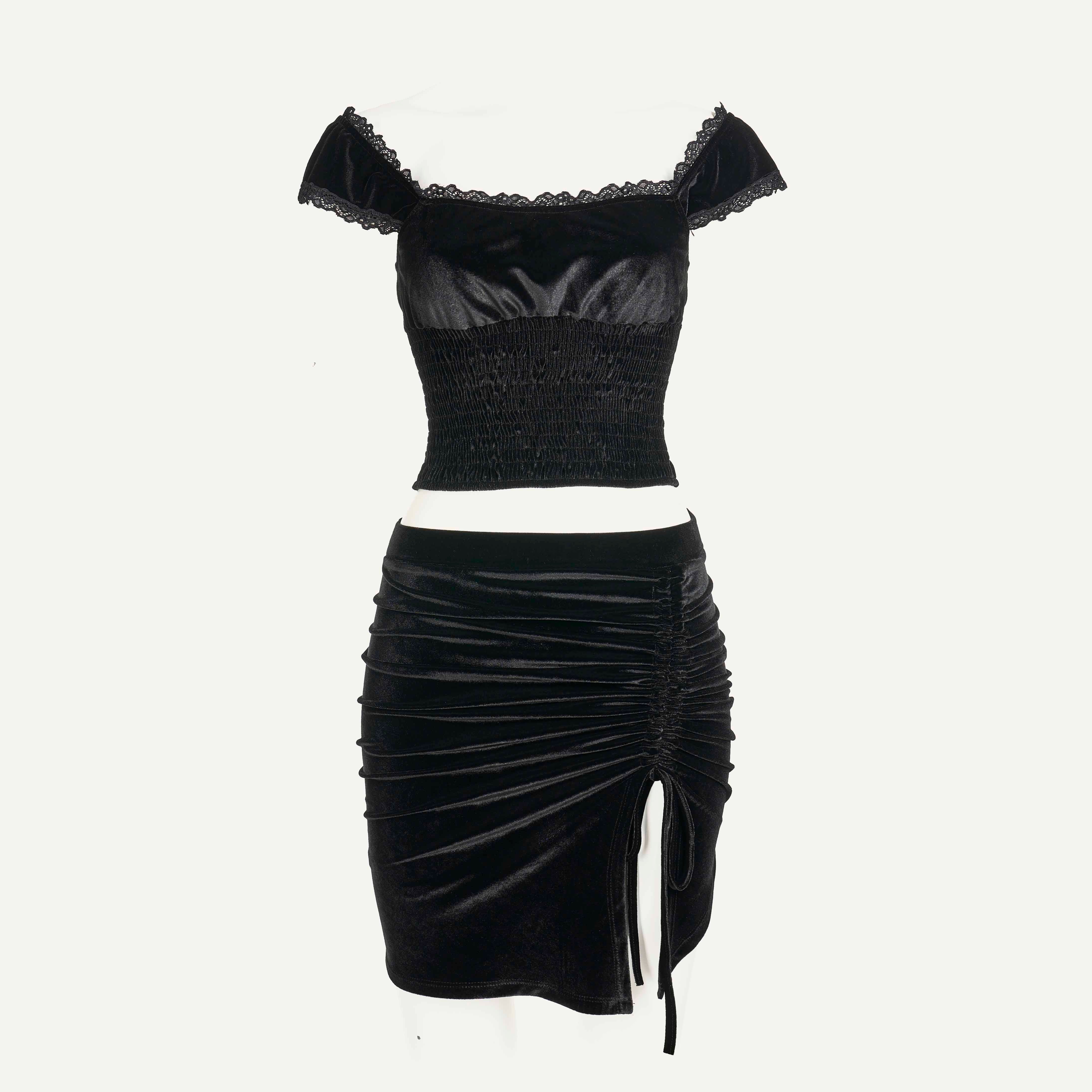 تألقي بإطلالة أنيقة وجذابة المصنوعه من القطيفه الفاخره. يتميز التوب بتصميم كشكشه ناعمه وأكمام قصيرة بأطراف دانتيل لمسة أنثوية راقية، بينما تأتي الچيبه بقصة قصيرة مع كسرات جانبية وربطة تمنحك مظهراً عصرياً وجذاباً. متوفر بعدة ألوان رائعة تناسب جميع الأذواق والمناسبات، مما يجعله خياراً مثالياً للسهرات