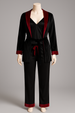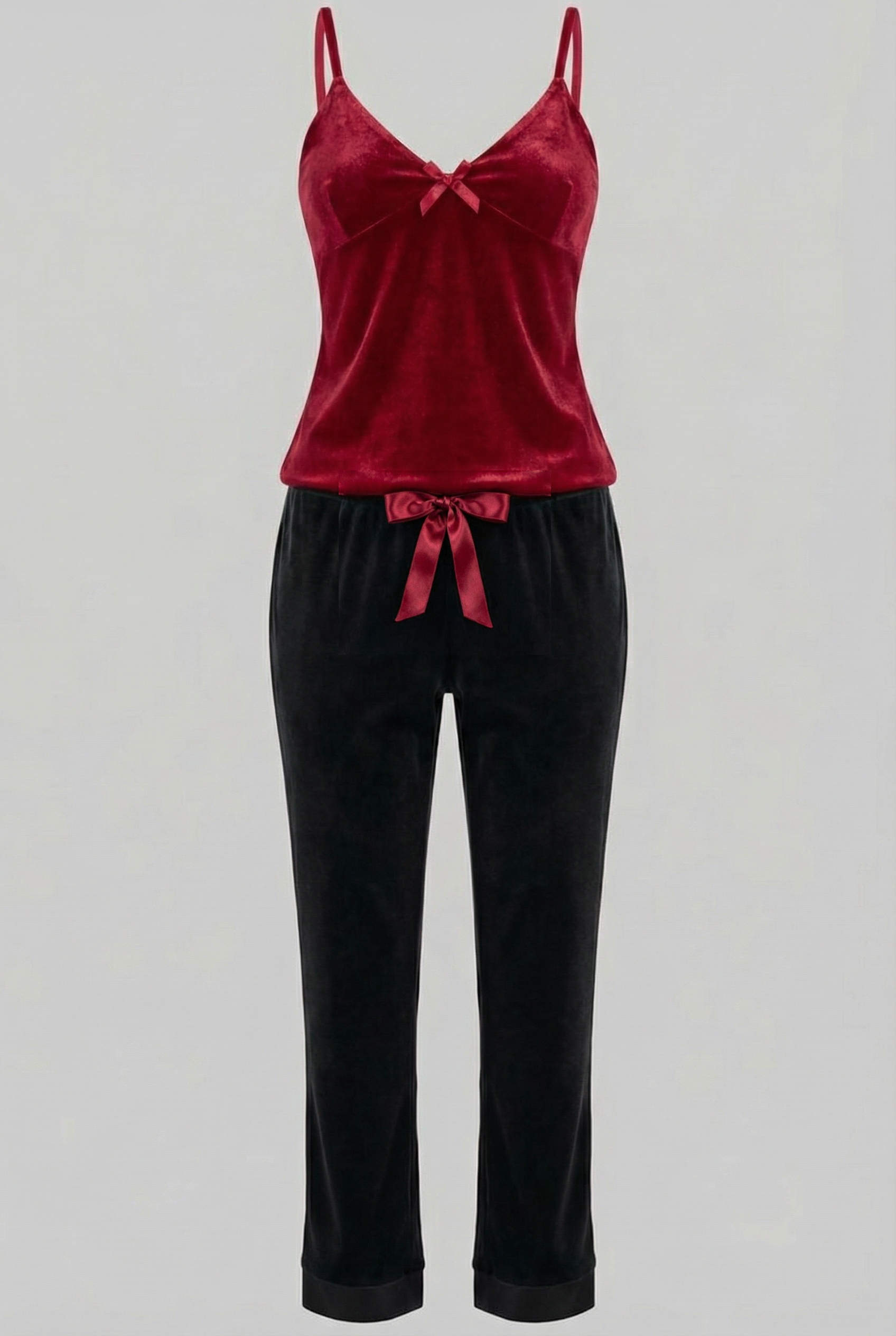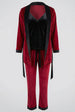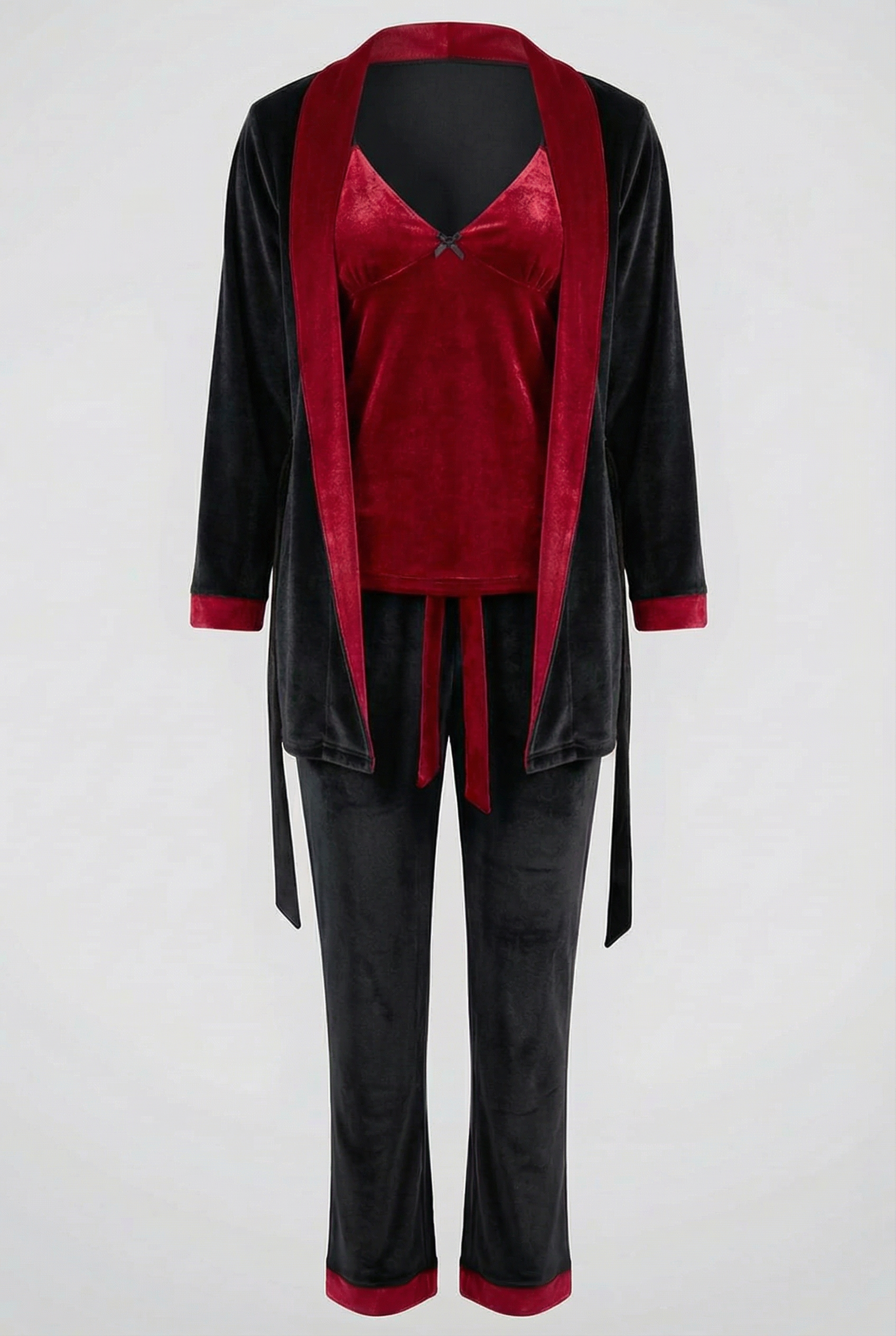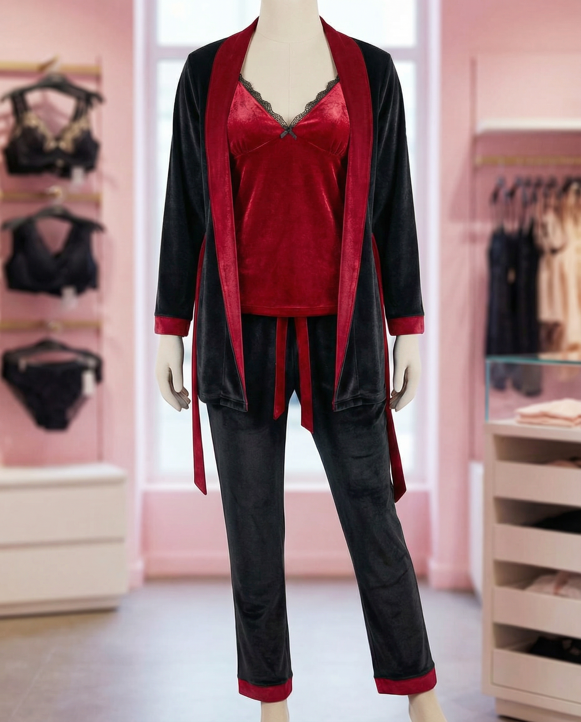 The set includes a long-sleeve robe with contrasting trim, a delicate velvet camisole, and relaxed-fit pants—creating a complete look that blends coziness with modern sophistication. Whether you're unwinding at home or preparing for an elegant night-in, this set brings a graceful, feminine presence to every moment.