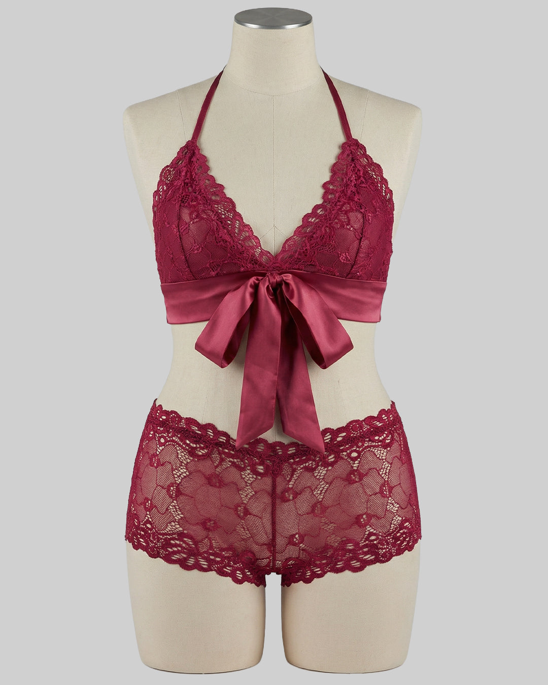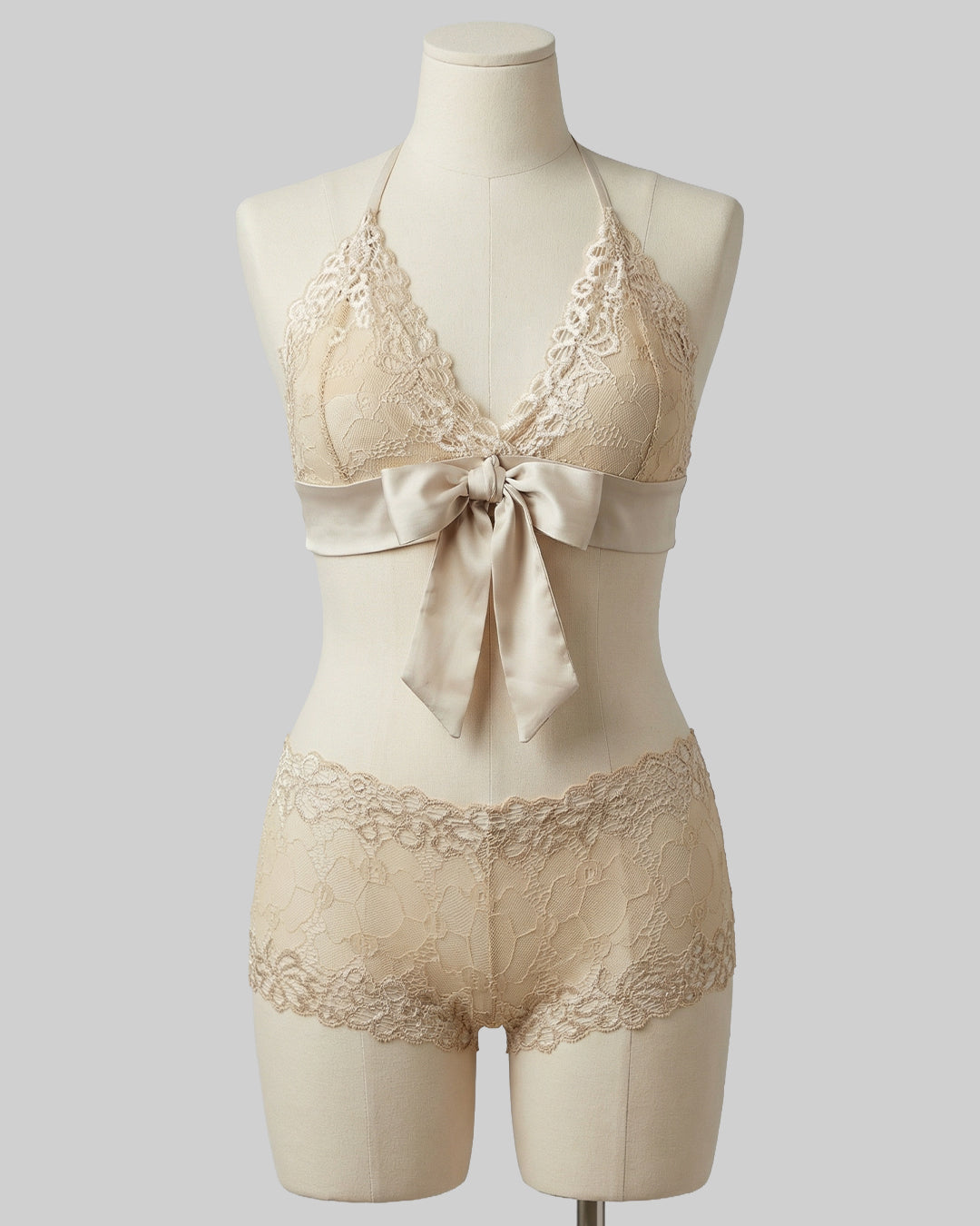 A refined expression of femininity, this lace and satin lingerie set blends delicate transparency with smooth, luxurious shine.