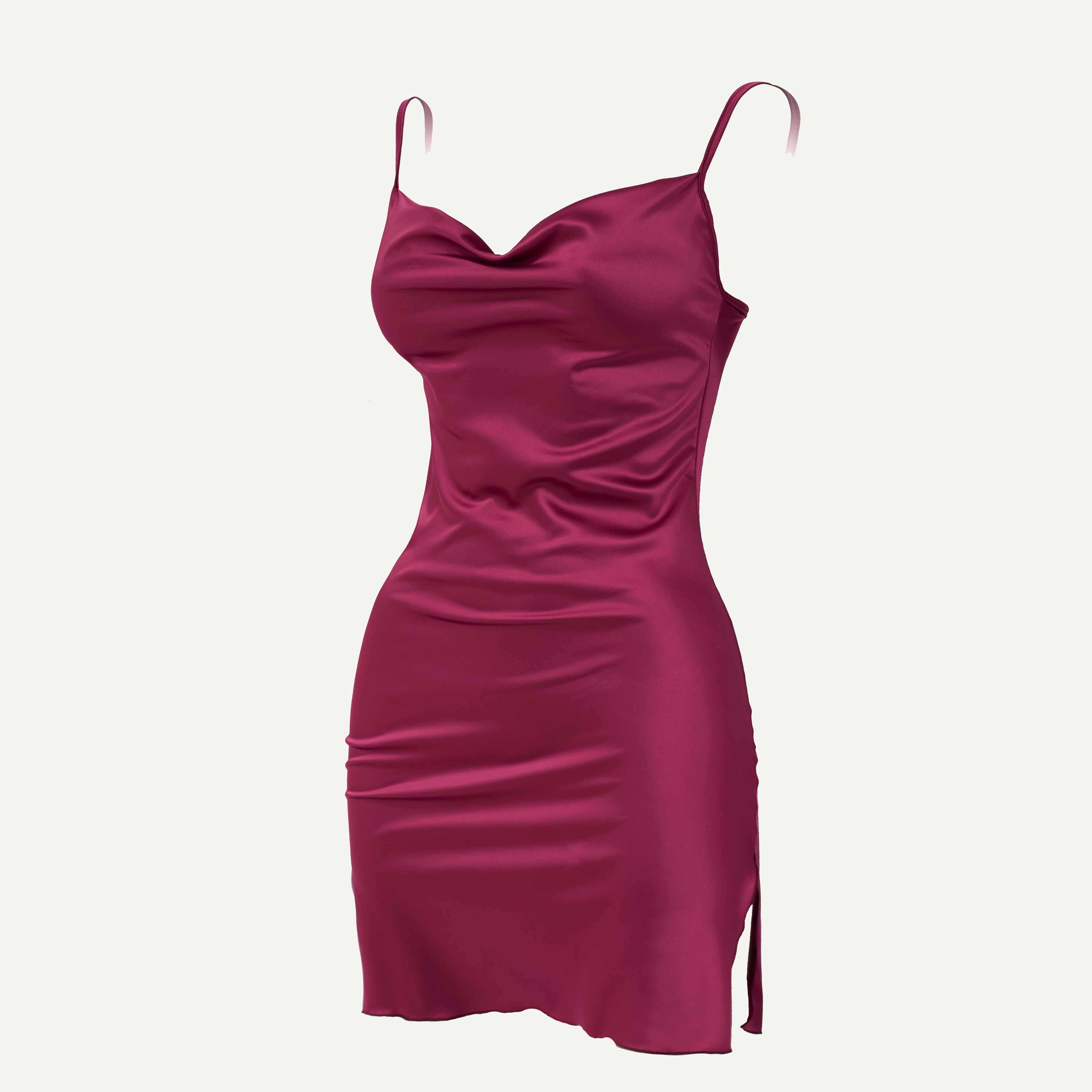 Embrace a captivating feminine look with this luxurious short satin dress. Designed with an elegant draped style that beautifully enhances your figure, it features delicate thin straps for a chic, modern touch. The side slit adds a bold accent and offers perfect freedom of movement, making it the ideal choice for evening occasions and special moments.