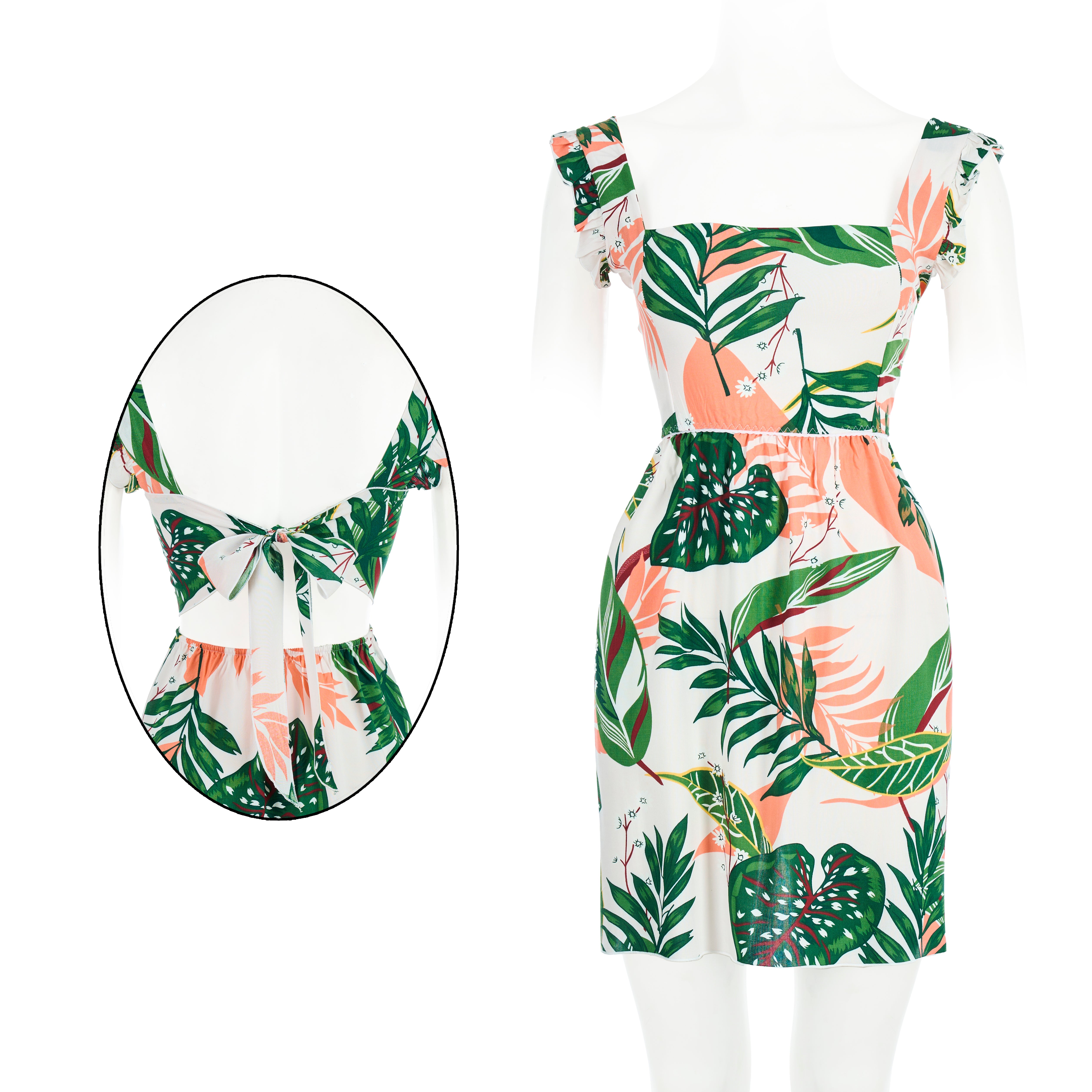 The dress is adorned with vibrant tropical leaf prints, giving you a playful, lively, and effortlessly feminine look — perfect for summer days and cozy home moments.
