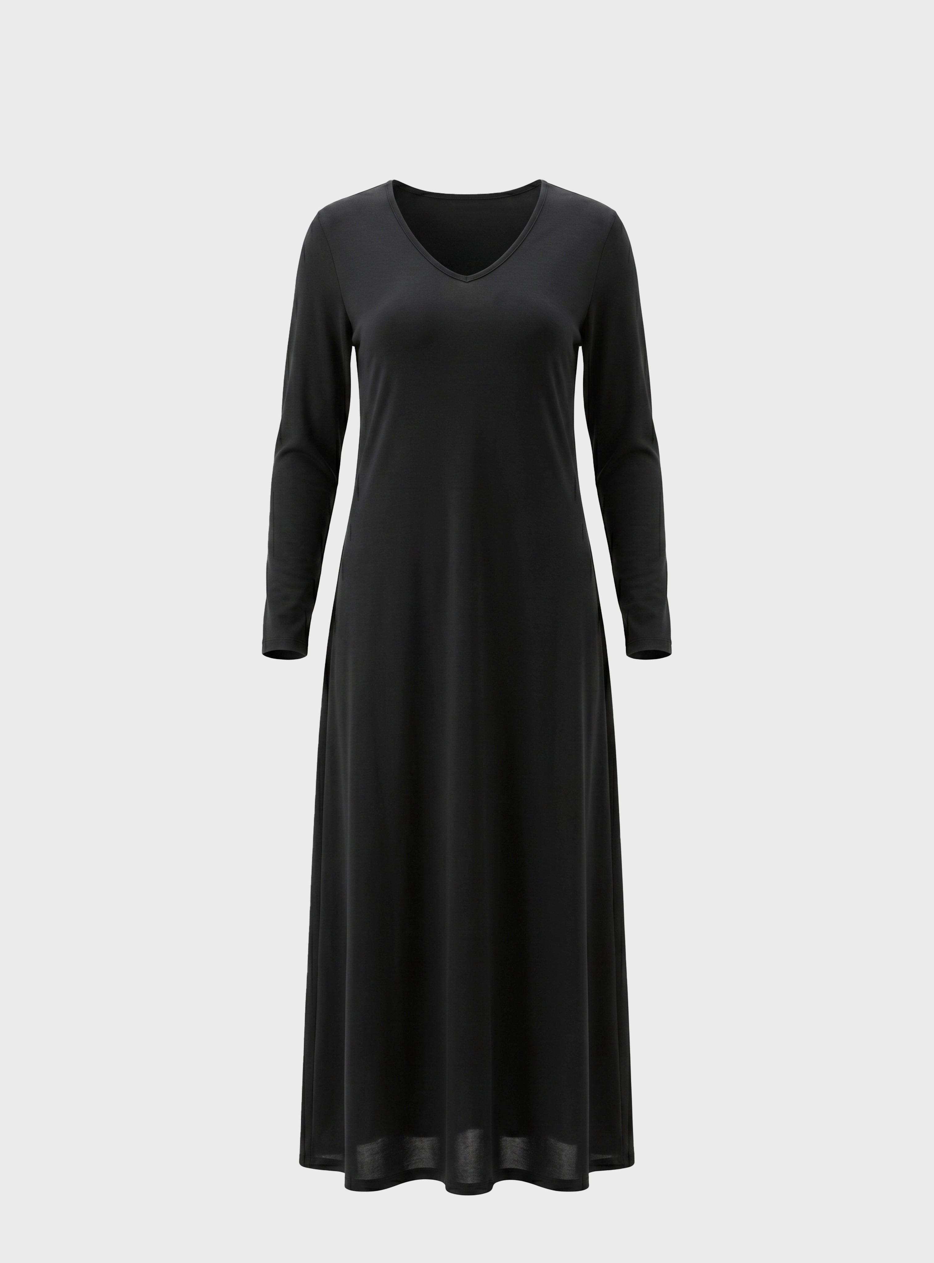 With its flattering V-neckline, long sleeves, and flowy maxi silhouette, this piece delivers a refined and effortless look. Whether worn on its own or paired with outer abayas, it serves as a versatile essential in any wardrobe.