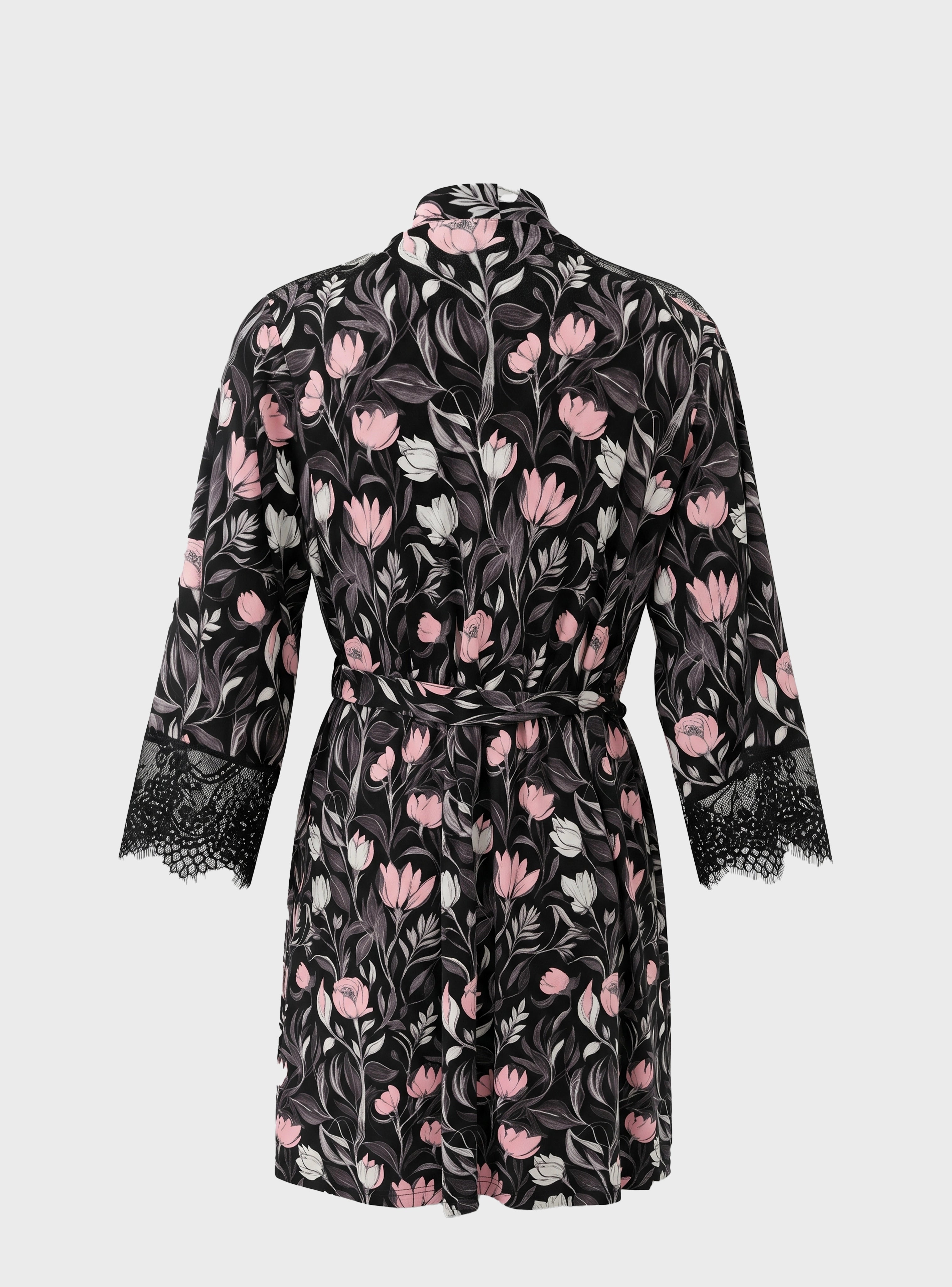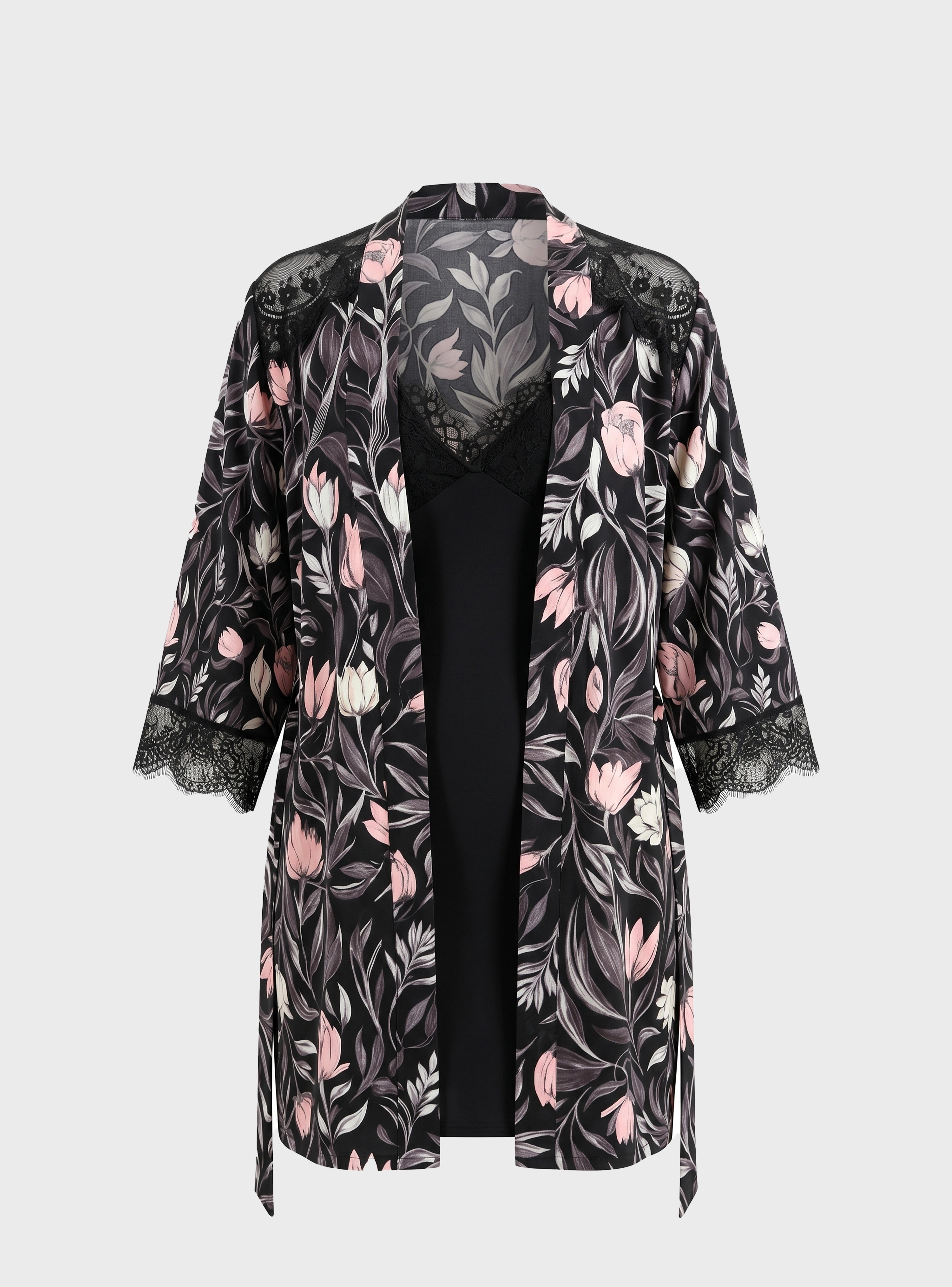 Layered over it is a lightweight satin robe adorned with a graceful floral print in soft blush tones, creating a beautiful contrast against the black base. The robe features a flowy, relaxed fit with lace-trimmed sleeves, enhancing the overall elegance while keeping the look effortlessly chic.