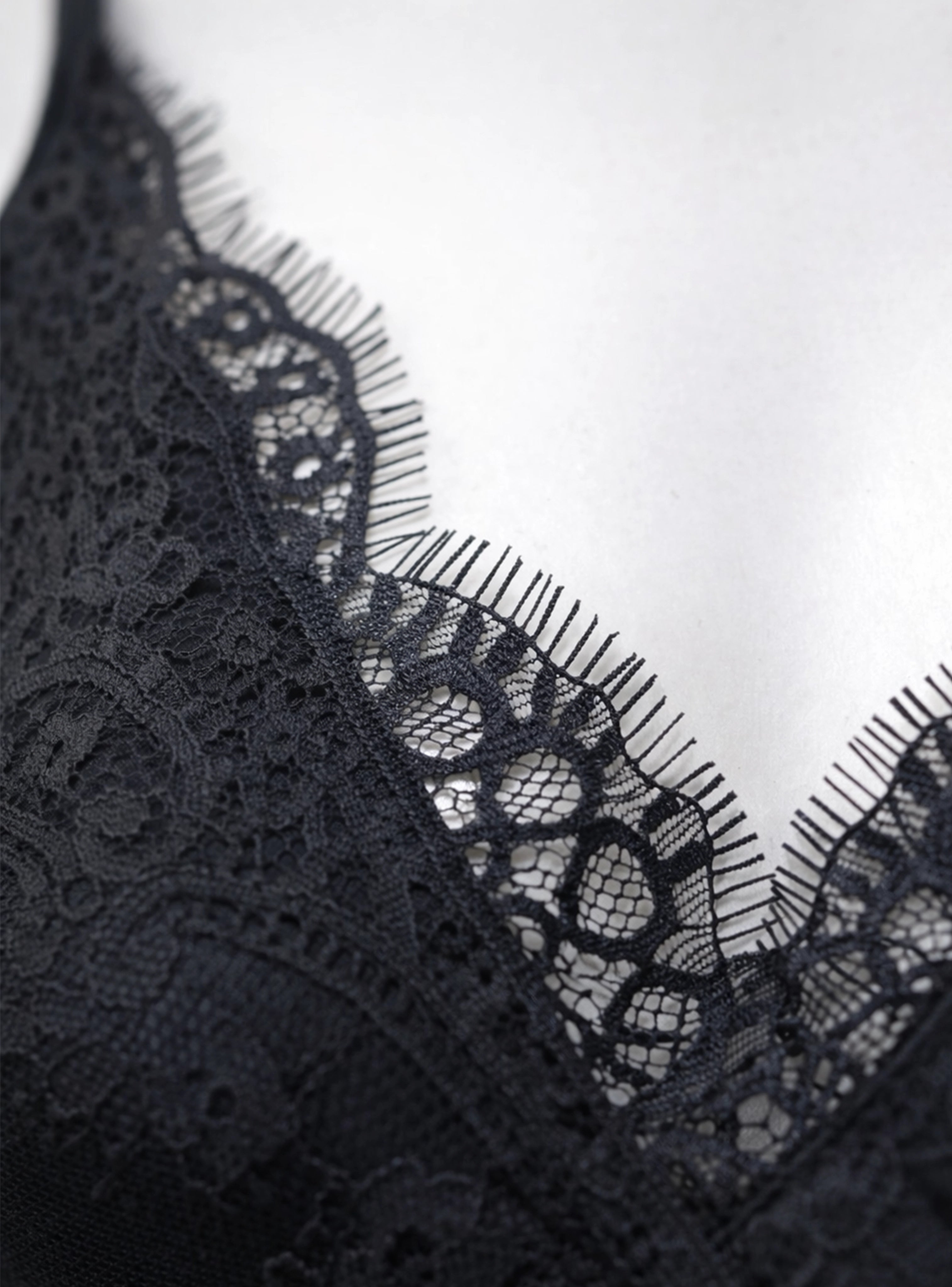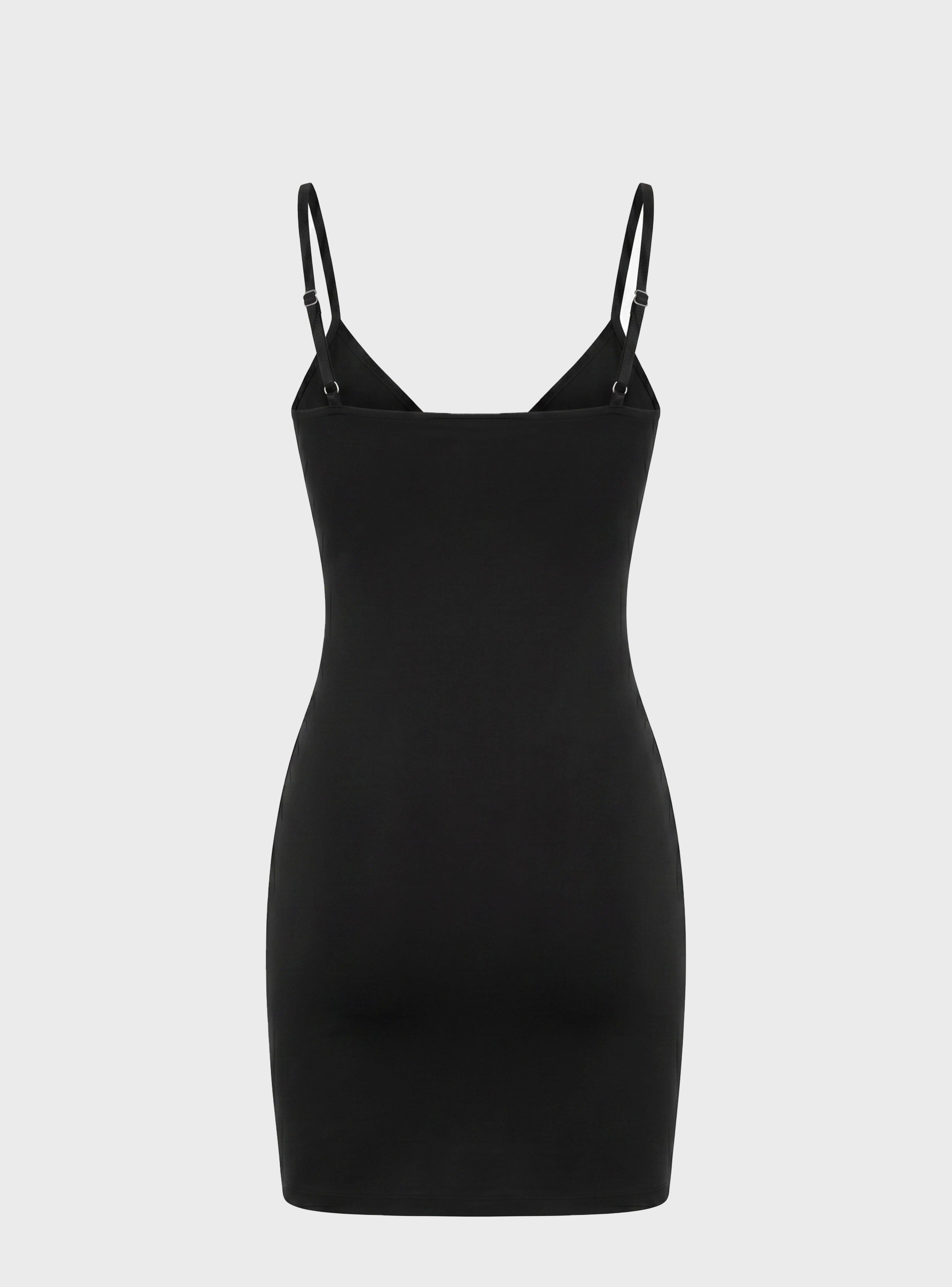 This set features a sleek black slip dress with a smooth, flattering silhouette that gently hugs the body, offering both comfort and elegance. The neckline is delicately detailed with lace, adding a subtle touch of charm and refinement.