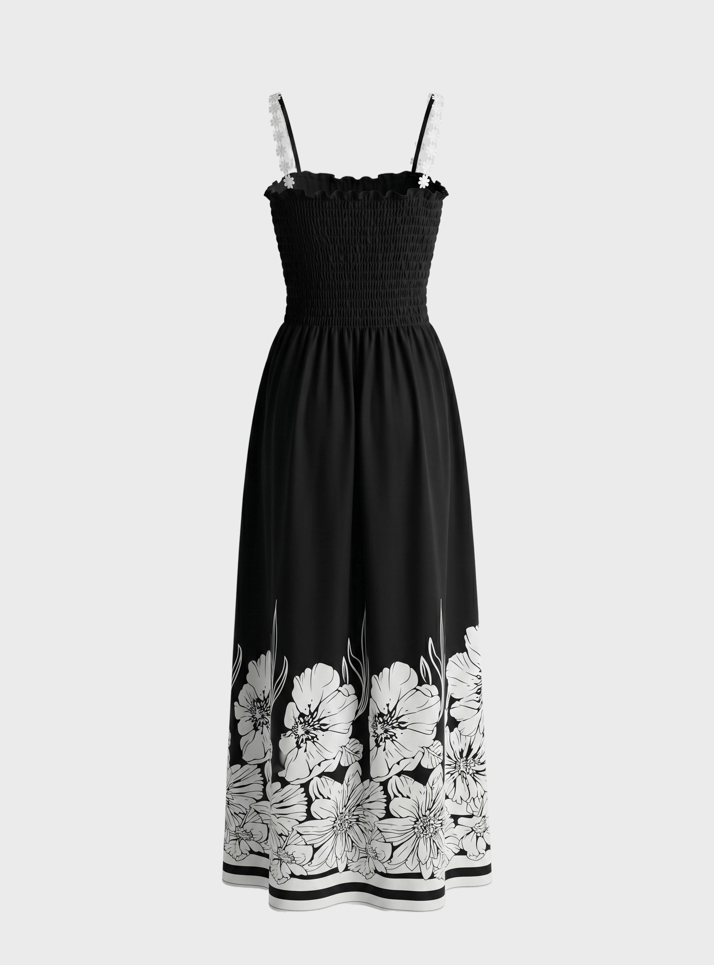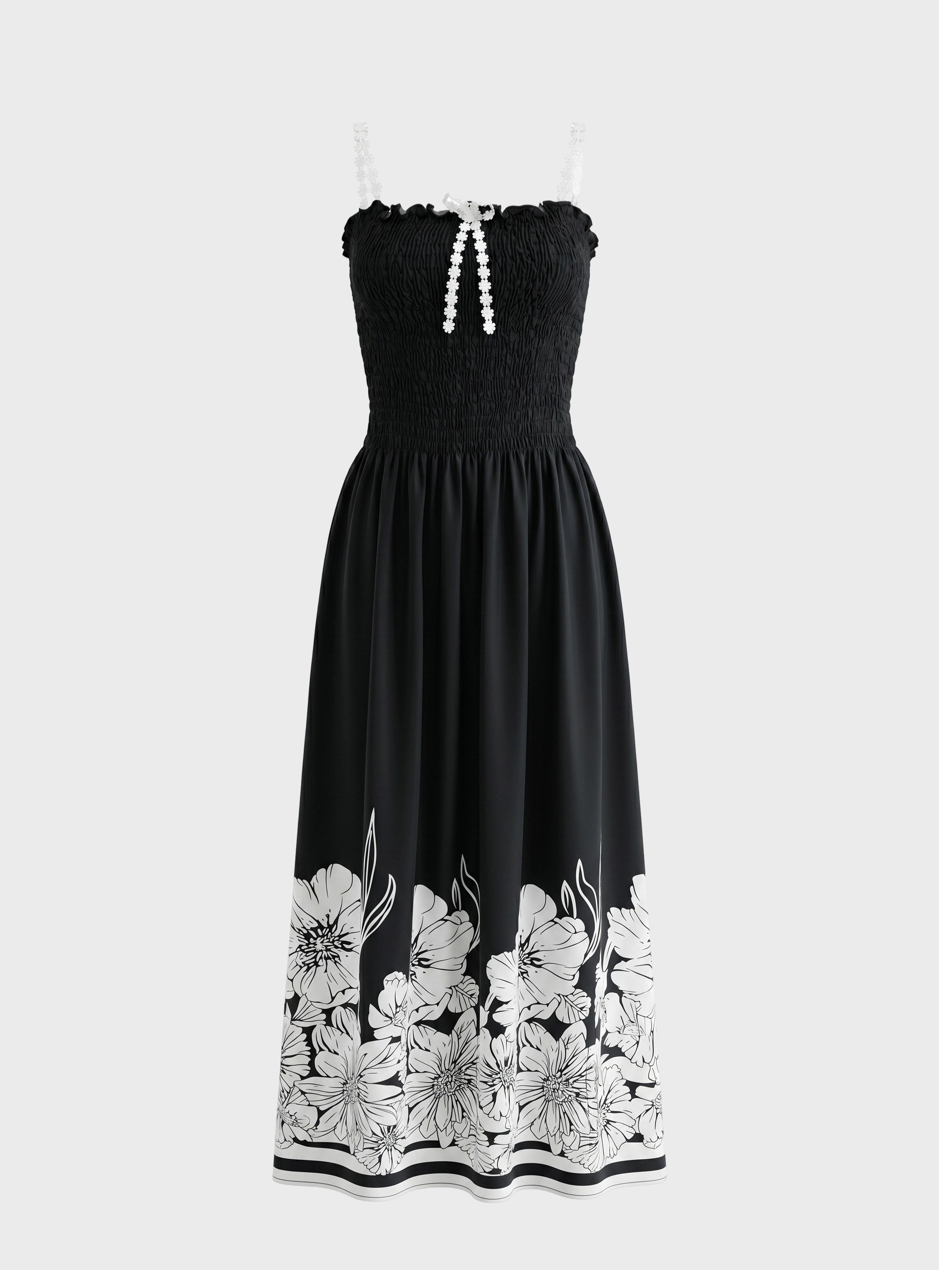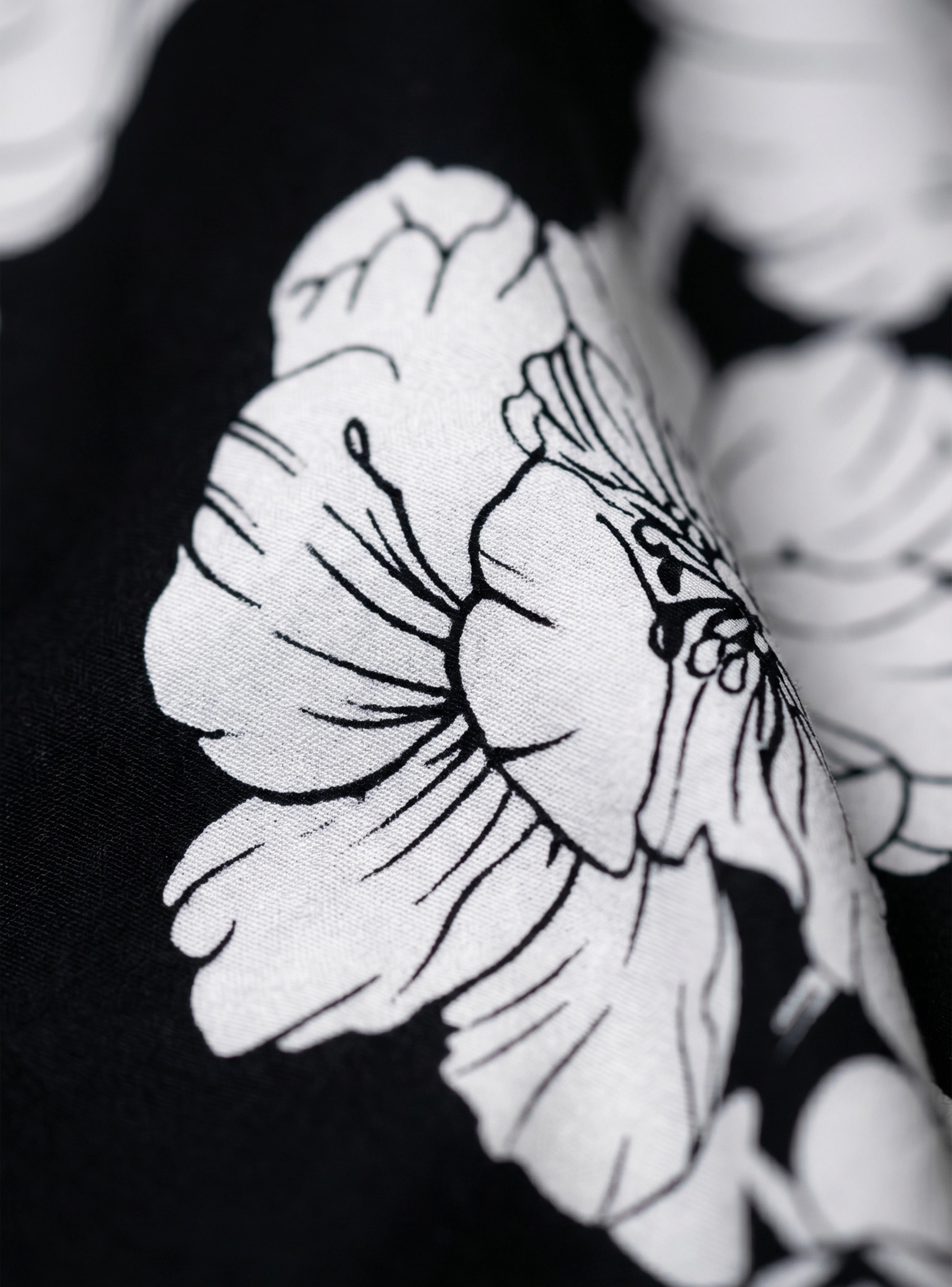 Designed in classic black with a beautiful white floral print at the hem, adding a refined and calm aesthetic.