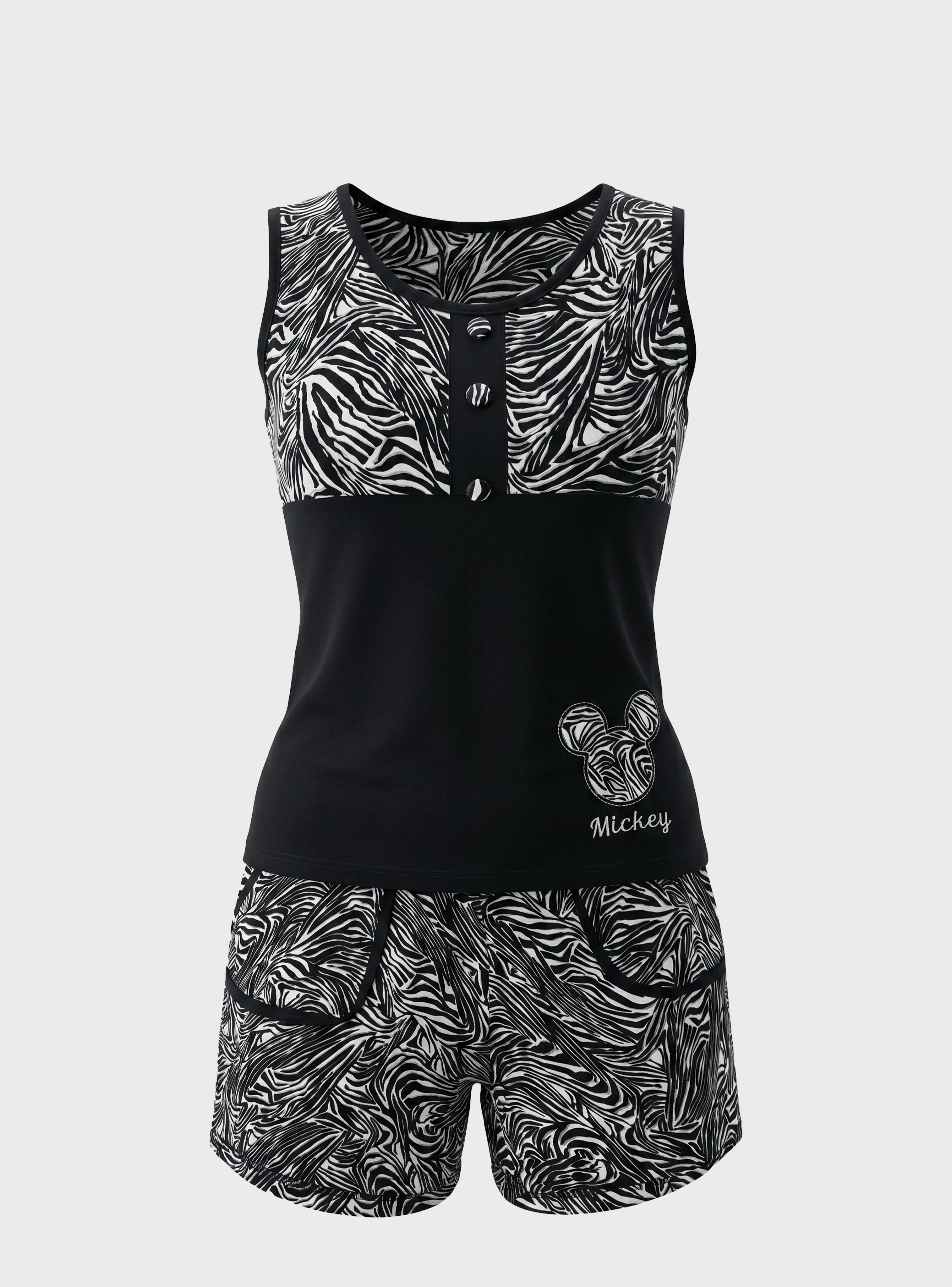 The sleeveless top is designed with a clean, comfortable fit and front button details, adding a casual and trendy feel. The contrast solid panel gives it a flattering shape, while the subtle Mickey-inspired print adds a cute and playful touch.
